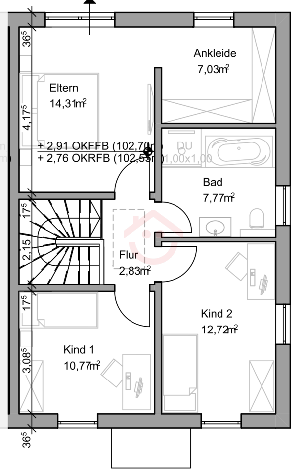 Im Obergeschoss befinden sich das großzügige Schlafzimmer mit direktem Zugang zur separaten Ankleide, zwei Kinderzimmer sowie das moderne Tageslichtbad.