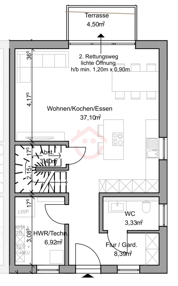Über den Eingangsbereich gelangt man in den Flur, von dem aus alle Bereiche des Erdgeschosses bequem erreichbar sind. Auf der linken Seite befindet sich der praktische Hauswirtschafts- / Technikraum mit ausreichend Platz für Haustechnik, Waschmaschine und zusätzlicher Stauraum. Auf der rechten Seite liegt ein separates Gäste-WC mit Fenster.