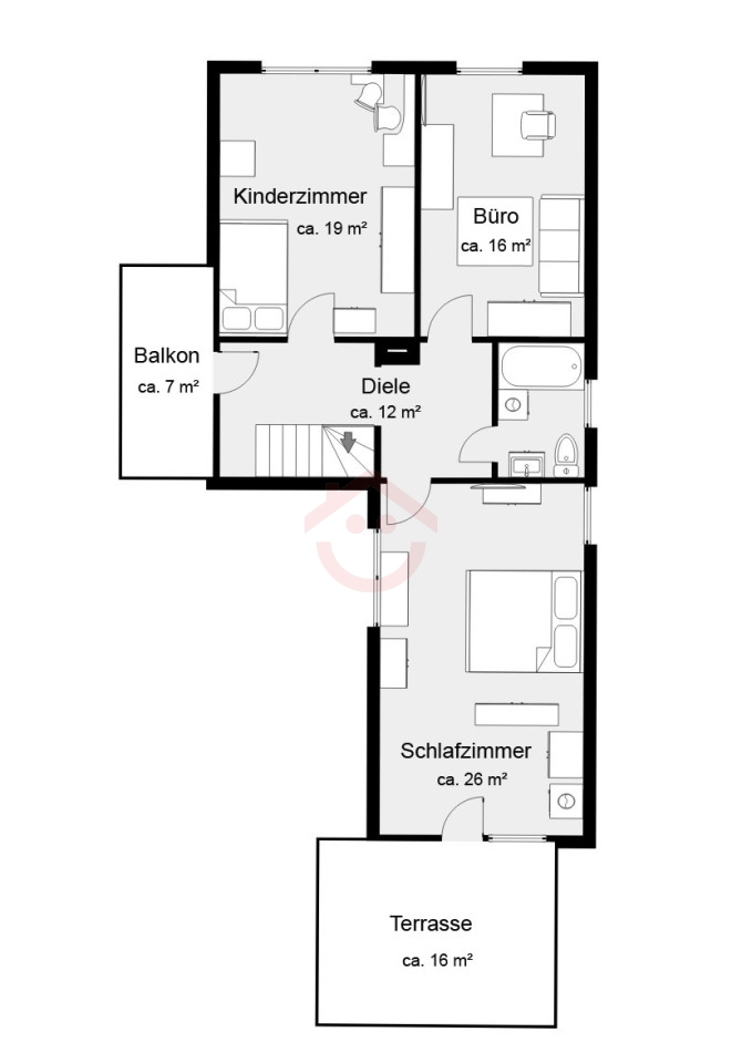 Im ersten Obergeschoss befinden sich drei Wohn und Schlafräume. Zwei davon, mit fast identischer Größe, sind der Gebäudevorderseite zugewandt und der dritte, größte Raum hat auf der Gebäuderückseite direkten Zugang zur Terrasse und dem angrenzenden Garten. Zentral gelegen ist das Tageslicht-Wannenbad.