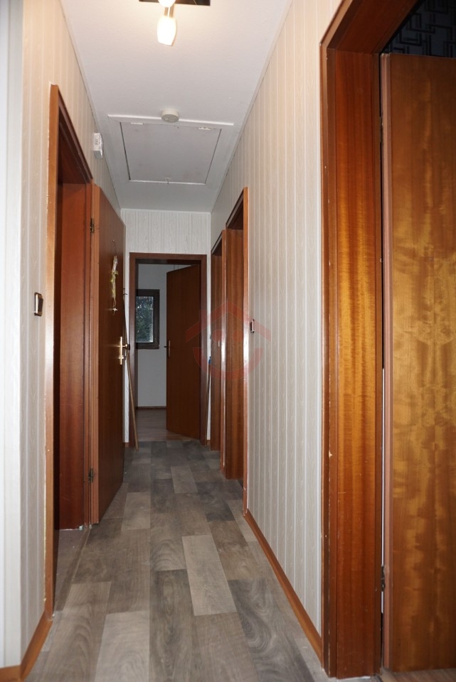 Der Haupteingang des Hauses ist über einige Stufen neben dem Gebäude erreichbar. Vom Eingangsbereich führt eine Treppe in die zweite Etage, während der direkte Zugang zur ersten Etage über einen Flur erfolgt. Diese Wohnebene überzeugt mit einem großzügigen Wohnbereich, der direkten Zugang zur Terrasse bietet ? ideal für gesellige Stunden im Freien. Die geräumige Küche mit angrenzender Vorratskammer sorgt für viel Stauraum. Ein frisch saniertes Tageslichtbadezimmer mit Wanne und Dusche sowie ein separates Gäste-WC erhöhen den Wohnkomfort. Zwei Schlafzimmer und die Verbindungstreppe zur Einliegerwohnung komplettieren diese Etage.