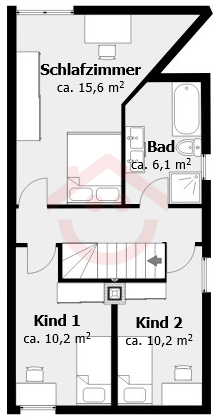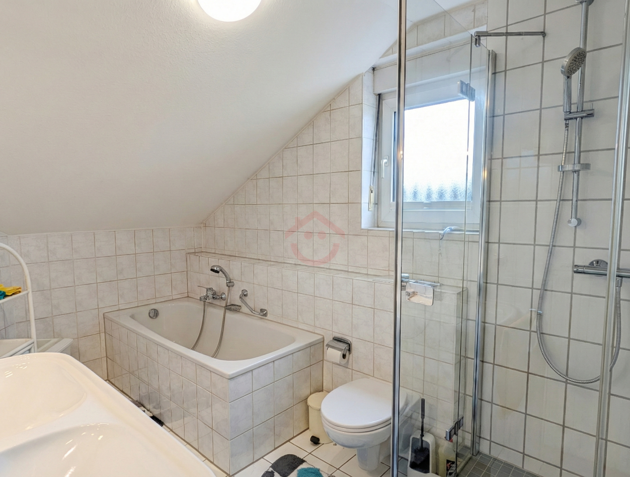 Im Obergeschoss schlafen und entspannen Sie. Aktuell finden Sie hier zwei sehr großzügige Zimmer und das zeitlos weiß geflieste Tageslichtbad mit Wanne und Dusche. Der Clou für Familien oder Home-Office-Nutzer: Der Grundriss ist flexibel! Das riesige Zimmer bestand ursprünglich aus zwei einzelnen Räumen. Da Fenster und Türen noch an der richtigen Stelle sitzen, können Sie mit minimalem Aufwand (eine einfache Trockenbauwand) den Ursprungszustand wiederherstellen. So wird aus der jetzigen großzügigen 3-Zimmer-Variante im Handumdrehen eine 4-Zimmer-Wohnung mit zwei Kinderzimmern.