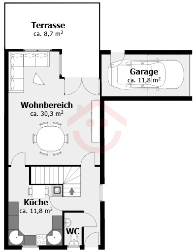 Ihr Auto steht sicher in der eigenen Garage mit elektrischem Tor. Besonders komfortabel: Durch den direkten Zugang gelangen Sie von der Garage durch den Garten ins Haus. Einkäufe tragen Sie so immer trockenen Fußes in die Küche. Der Garten ist pflegeleicht angelegt, perfekt zum Grillen, ohne dass Sie das ganze Wochenende mit Gärtnern verbringen müssen.