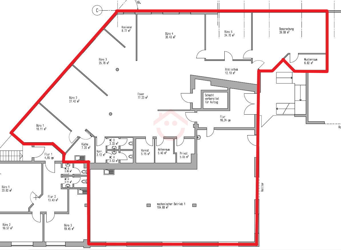 Der ca. 77 m² große Eingangsbereich bietet einen direkten Zugang zu den offenen Büros bzw. Behandlungsräumen 3 und 4 sowie zum mittig gelegenen Kopierraum. Raum 1 ist ein abgetrennter Bereich, während Raum 2 durch eine abschließbare Glasfront ausgestattet ist. Ein kurzer Flur führt zu Raum 5, ebenfalls mit einer Glasfront abgetrennt. Der ca. 40 m² Besprechungs- oder Gruppenraum ist mit kleinem Lagerraum ausgestattet.