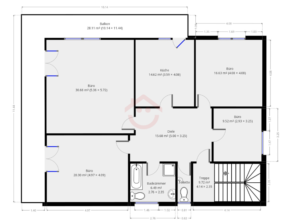 Die beiden größten Büroräume und die Küche/Personalraum haben jeweils Zugang zum umläufigen Balkon.